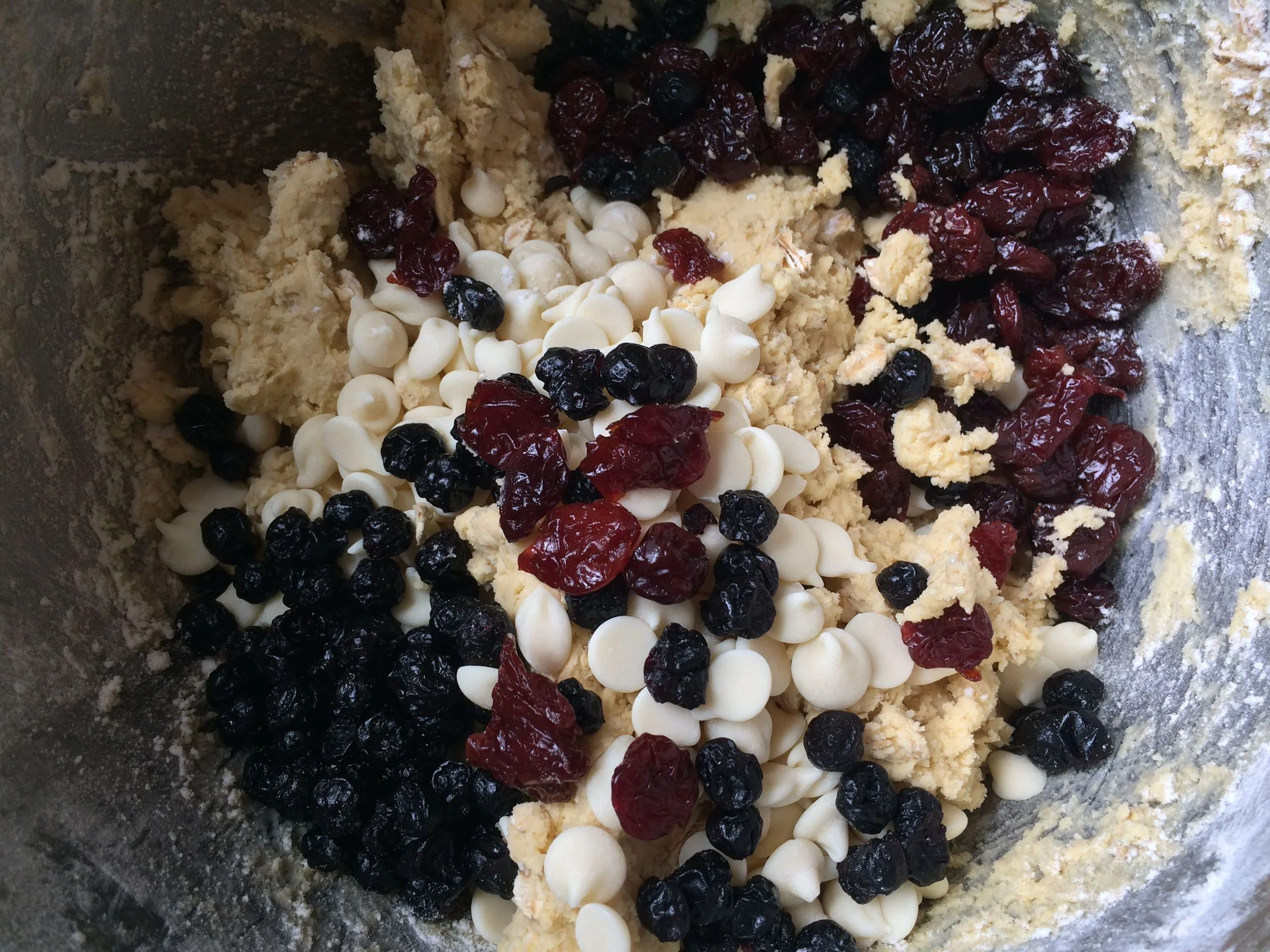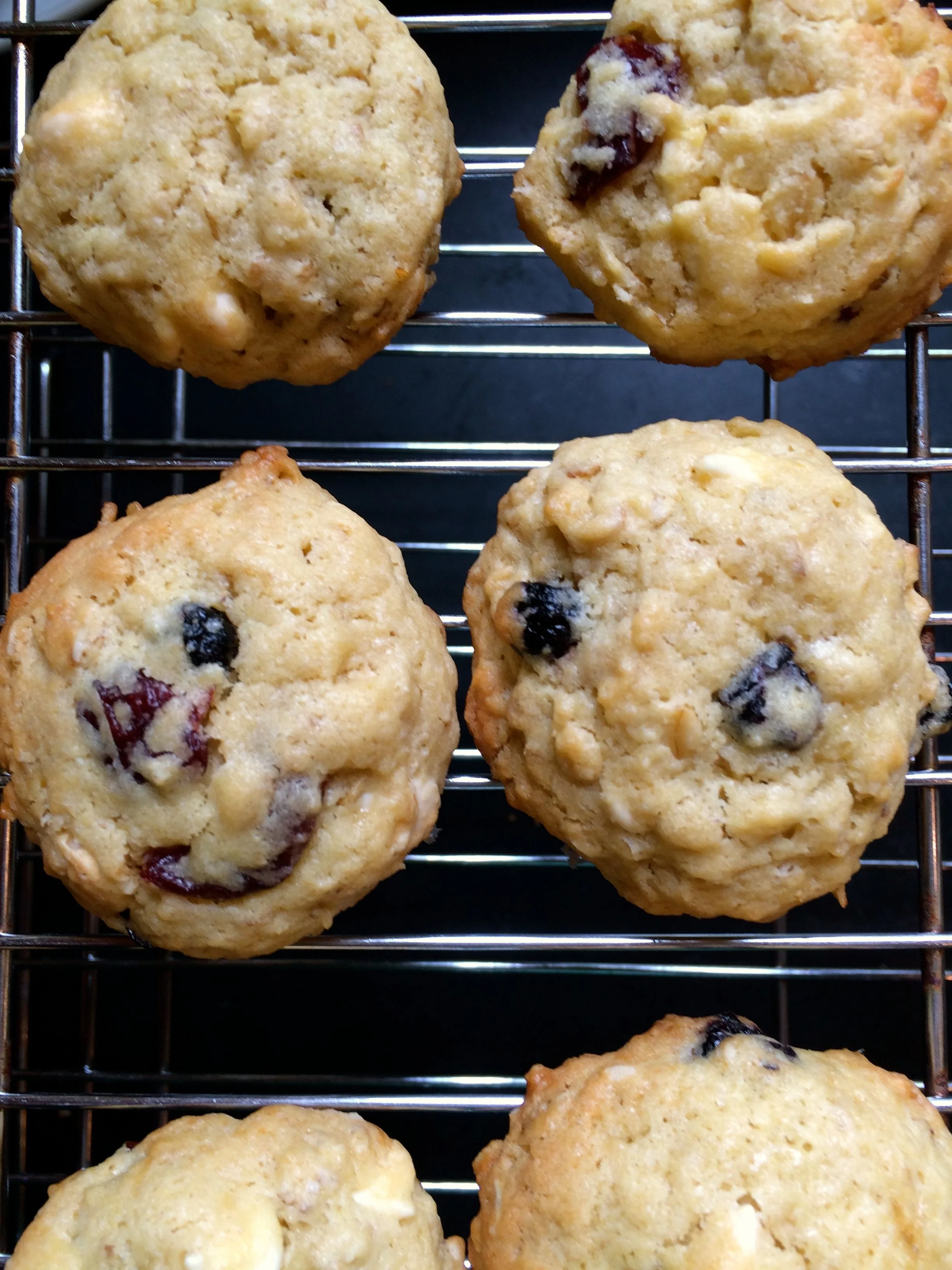 I wrote back and said, "That sounds like cookie propaganda!" But I was curious, you see. My in-laws live two hours away and don't buy their own cookies because, as my mother-in-law has told me, I've "spoiled" them for store-bought cookies, both the supermarket-bakery-kind and the chemical-laden, metallic-tasting, packaged kind. I then quizzed them on the taste and texture: dried cranberries AND dried blueberries or were the blueberries fresh? Was it soft? Chewy? Hard? Crispy? Sweet? I thought chopped white chocolate would go better than chips; it needed a contrast. Chewy but not too soft: that's what they said.